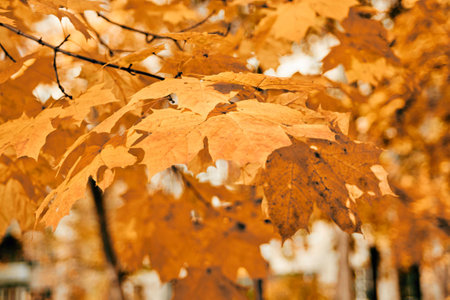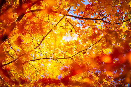Abstract foliage background, beautiful tree branch in autumnal forest, bright warm sun light, orange dry maple leaves, autumn season
