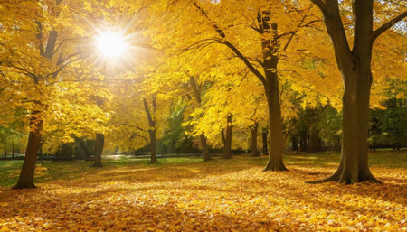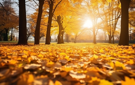Autumn park with yellow leaves and sun rays. Beautiful nature background