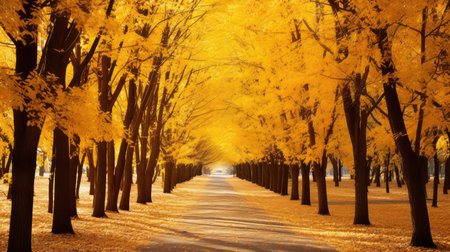 A scenic pathway surrounded by vibrant autumn foliage, showcasing the golden hues of the season. Generative Ai