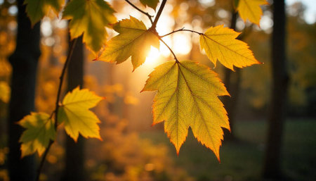Vibrant autumn leaves glisten under soft sunlight in a forest setting during the fall season