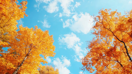 A stunning perspective of vibrant autumn foliage showcasing brilliant yellow and orange leaves against a clear blue sky dotted with fluffy clouds.