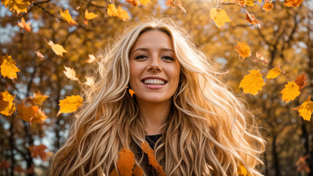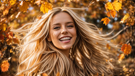 Portrait of a beautiful happy girl with long hair on a background of autumn leaves
