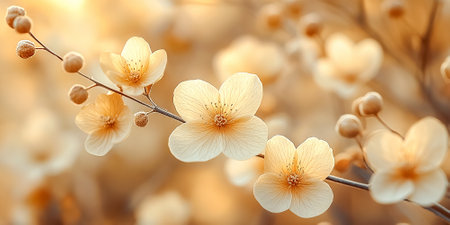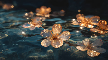A stunning display of golden flowers floating gracefully against a warm, blurred background, evoking feelings of elegance, serenity, and beauty. Ideal for art or design projects.