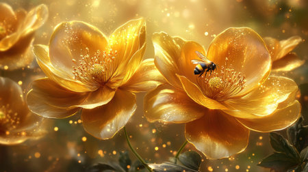 A stunning close-up of golden flowers illuminated by sunlight, featuring a bee pollinating. The vibrant details create a peaceful and enchanting atmosphere, showcasing nature's delicate beauty.