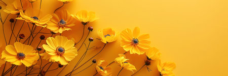 A close-up shot presents numerous yellow flowers in full bloom, their delicate stems reaching upwards. The flowers, with a warm color palette, contrast with a soft, overcast sky in the background. The composition suggests an outdoor environment, ideal for various editorial and commercial applications related to nature and beauty.