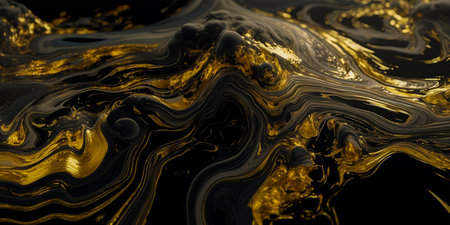 Black liquid texture background, dark waves of oil and gold shine, abstract luxury marble effect. Concept of paint pattern, surface, sunshine, watercolor, swirl and wallpaper. Generative AI