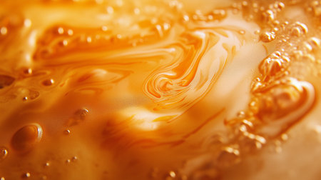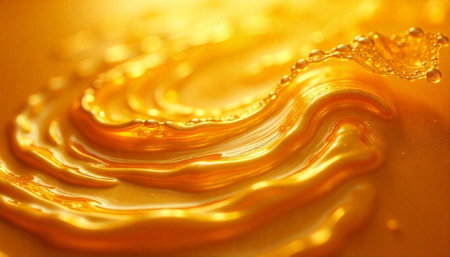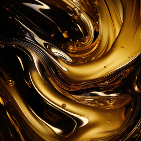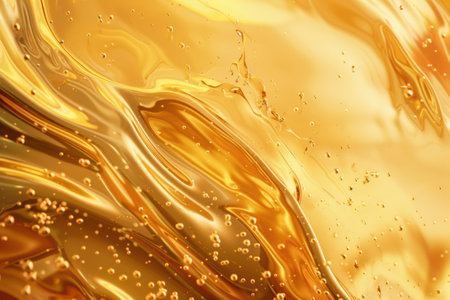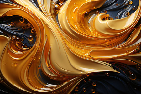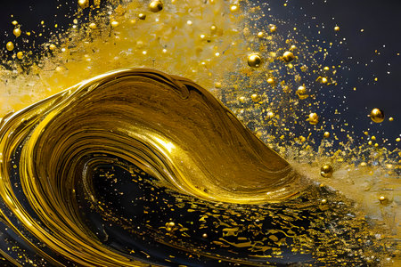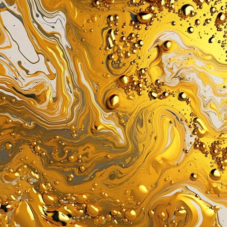 An abstract artistic image that brilliantly showcases golden fluid textures enhanced with swirls and bubbly effects