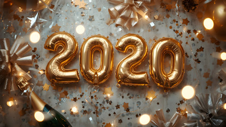 A celebratory image featuring the year 2020 represented with golden numerals and a shiny ornament, set against a backdrop of warm bokeh lights, evoking a festive New Years atmosphere.