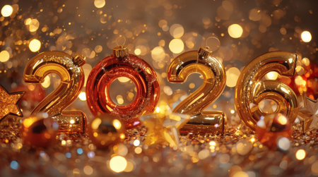 Banner. Shiny gold numbers 2026 and a beautiful bokeh on a red background. Happy New Year and Christmas.