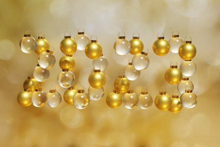 3d render of gold and glass Christmass baubles in a shape of new year 2023 on a golden bokeh background for your festive project