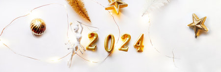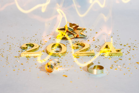New Year holiday background. Golden numbers 2024 with ribbons and decoration