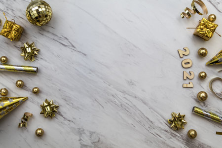 A top view of golden Christmas decorations on a grey background - 2021