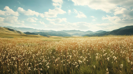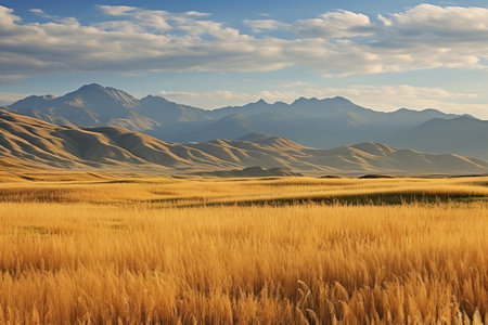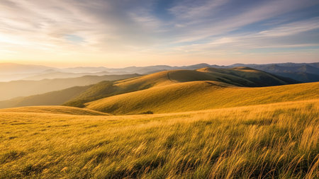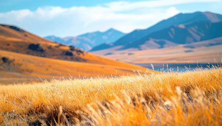 Serene autumn landscape golden grass in foreground, rolling hills and distant mountains under a bright, cloudy sky