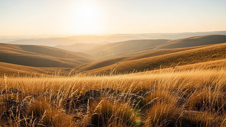 Golden dry grass in the foreground with rolling hills stretching to the horizon under a bright sunrise.
