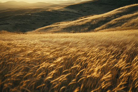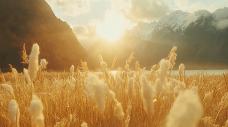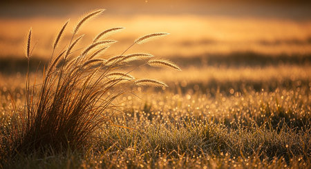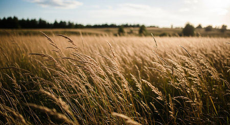 Beautiful peaceful meadow with tall grasses swaying in soft breeze under golden sunlight