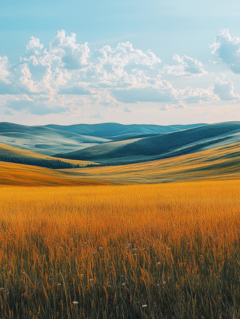 Stunning landscape featuring golden fields meeting rolling hills, under a vast sky dotted with fluffy white clouds