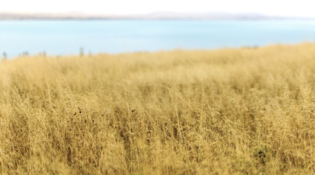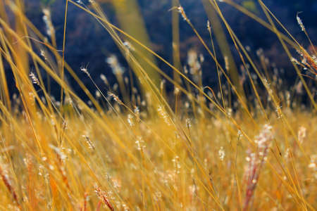 Autumn yellow grass in a golden field, close up