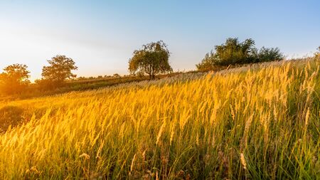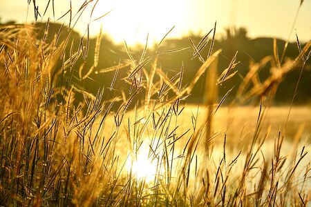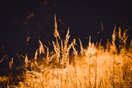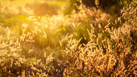 Golden ears of grass are illuminated by the bright sunlight on a warm autumn evening. Nature is beautiful.