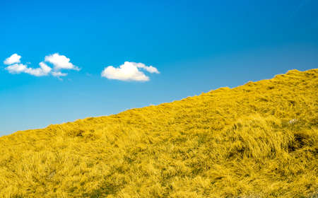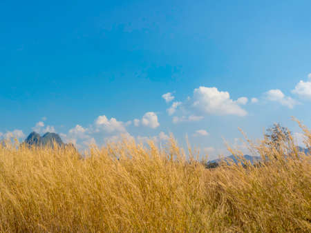 Grassland with blue sky background. Nature background with copy space.