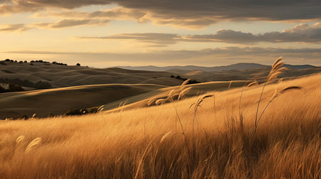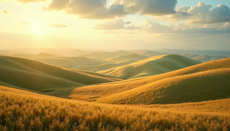 Expansive golden prairie grass fields stretch across rolling hills under a warm sunset sky with scattered clouds and...