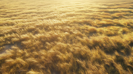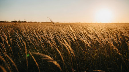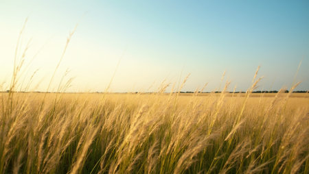 Tall golden grasses dance in the breeze under a clear blue sky during the warm afternoon. The sun shines brightly, illuminating the serene landscape in a peaceful setting.
