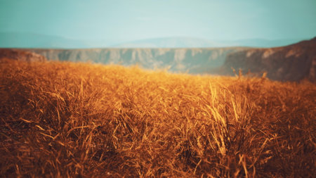 Waves of golden grass sway gently in the breeze, creating a serene landscape. In the distance, rugged cliffs rise against a clear, blue sky, signifying the beauty of nature.