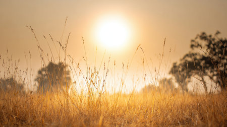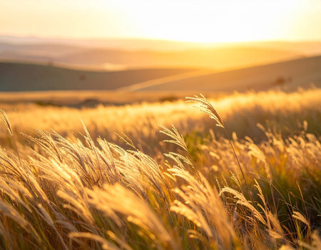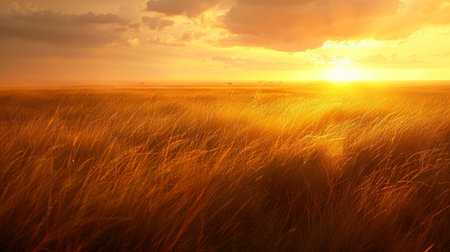 A breathtaking sunrise casts a warm golden glow over a tranquil landscape, where tall grasses gently sway in the soft breeze. The sunlight illuminates the clouds, creating a scenic and peaceful outdoor setting perfect for nature enthusiasts and photographers.