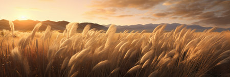 Panorama view, the sun setting through mountains on tropical grassland. Art transparent wild grass in full bloom in springtime. Abstract shadow, sun rays with lens flare.