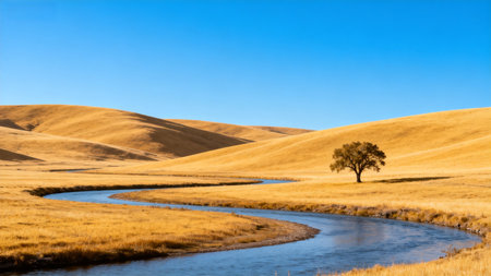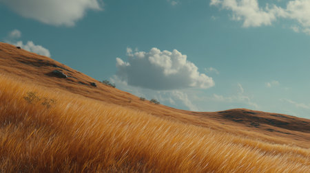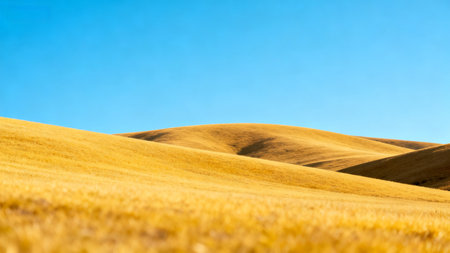 This image showcases a peaceful landscape featuring rolling hills draped in golden grass, under a clear blue sky. The tranquility of nature creates a calming scene, ideal for various projects.