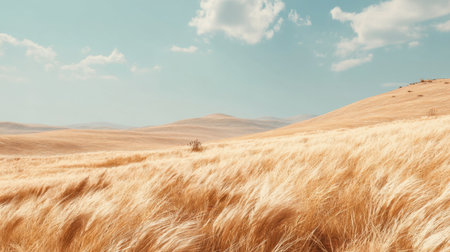 Golden grass sways gently in a vast field beneath a clear blue sky filled with fluffy clouds.