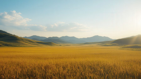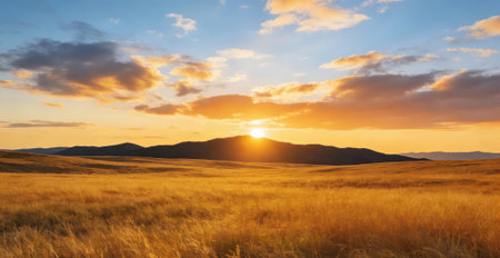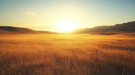 The warm sun sets over a sprawling field of tall golden grass, casting a serene glow across the landscape and highlighting the gentle contours of the nearby hills.