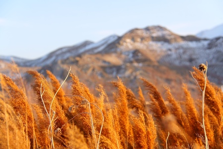 Autumn mountain landscape, high red dry grass on the background of mountains and blue turquoise sky