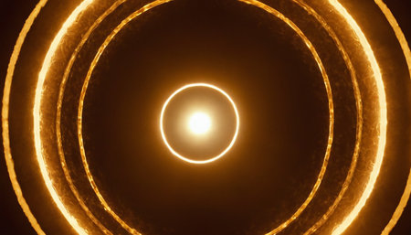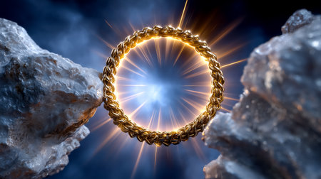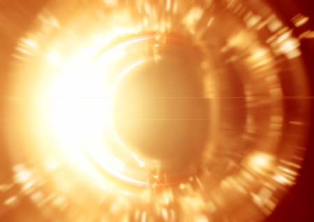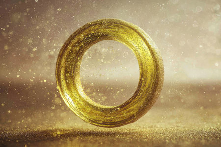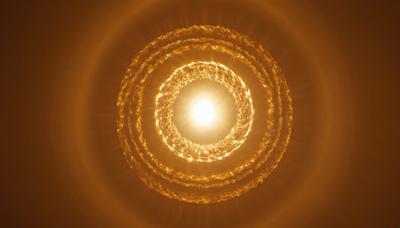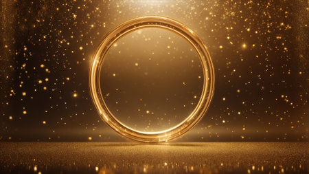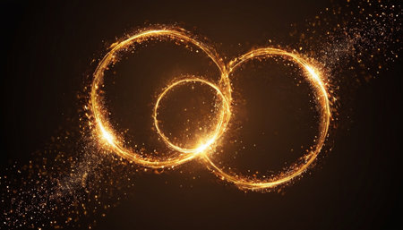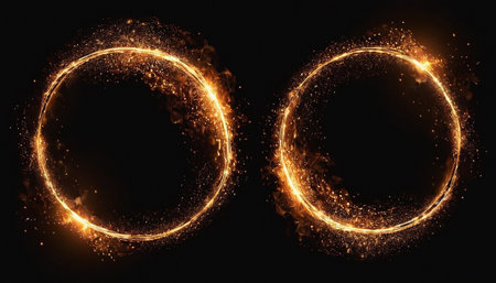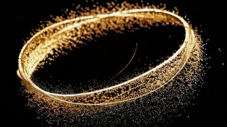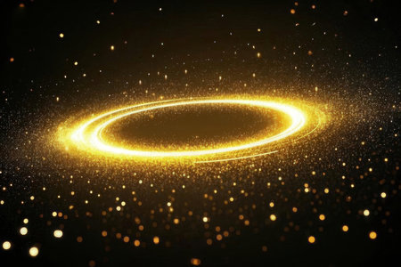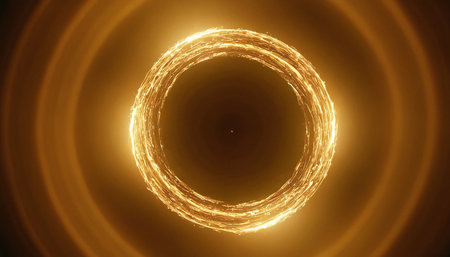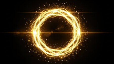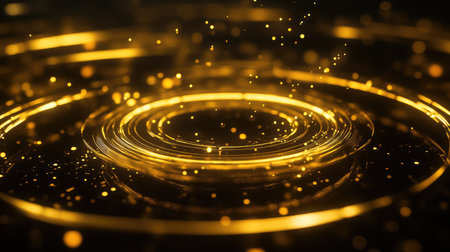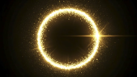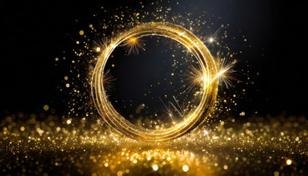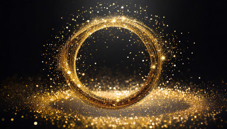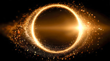 A luminous golden halo surrounds a vibrant core, with sparkling flecks dancing dynamically against a deep background, evoking a mystical and captivating glow.