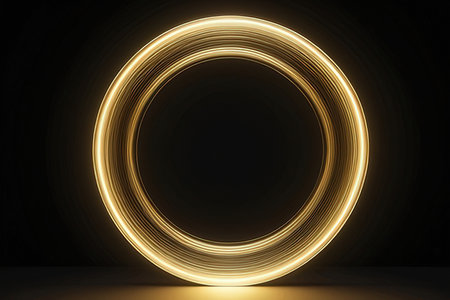 Abstract neon circle lines with empty copy space inside isolated on black background. Colorful led lights long exposure rotation photo. Shiny light source. Cosmos space sun planet abstraction.