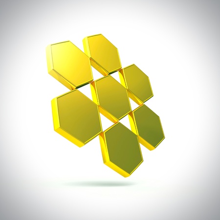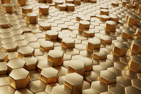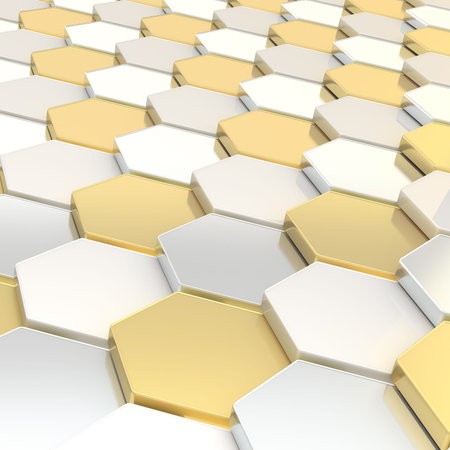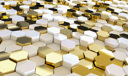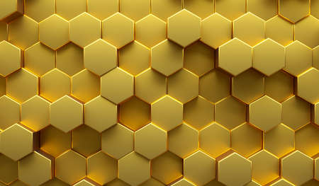 Abstract background of graphic elements - mosaic of gold hexagons with metal shadow effects on the edge - 3D illustration