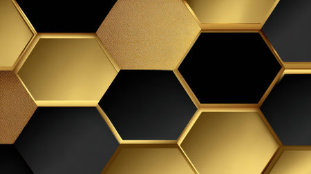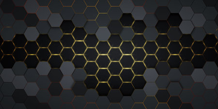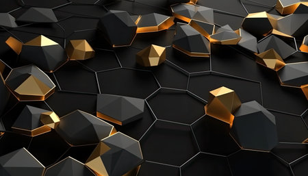 Abstract 3d rendering of black hexagonal background with golden and black elements