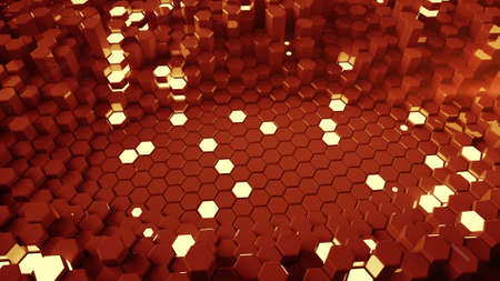 Abstract hexagon geometry background, gold hexagonal pattern randomly waving, animation 3D rendering