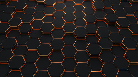 Abstract background made of black and orange hexagons. 3d render