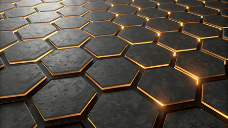 3d rendering of abstract hexagon background in golden and black color