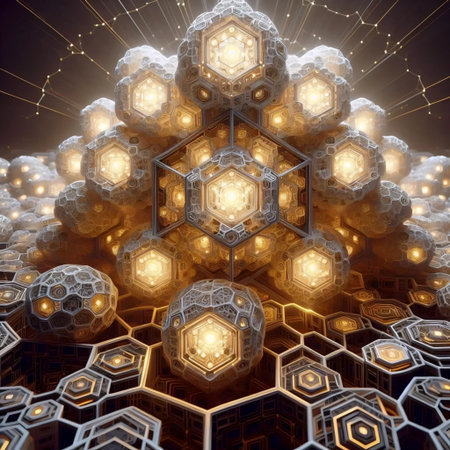 A modern abstract design featuring a honeycomb pattern with golden and brown hues