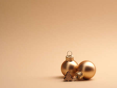 Golden vintage Christmas baubles on a beige background with space for your text or image, seasonal holiday concept