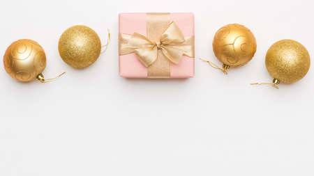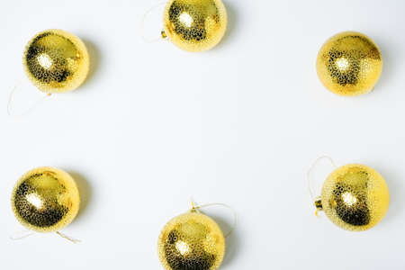 Christmas or New Year composition with golden balls on white background. Flat lay, top view with space for text