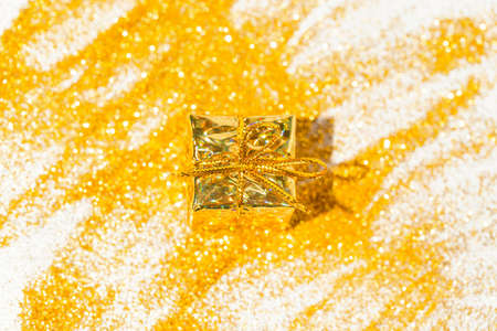 Decorative present box on golden glittering background. Christmas or birthday gift. Celebration and party concept. Flat lay. Top view