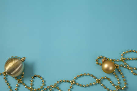 Golden Christmas and new year decorations. Beads and balls on light blue background. Top view