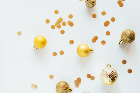 Golden Christmas balls and confetti on a white table in bright light