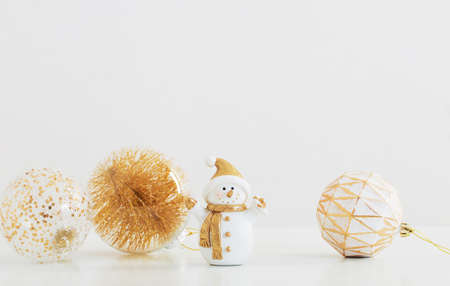 Merry Christmas and Happy Holidays greeting card background with copyspace on the left. Golden Christmas gifts and decor on white background top view. Winter xmas holiday theme in flat lay style