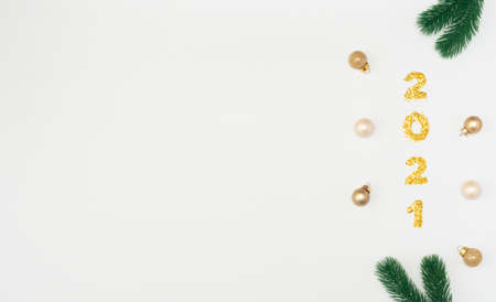 Christmas, New Year white background with fir tree branches, numbers 2021 and small decorations. Xmas and Happy New Year holiday concept.