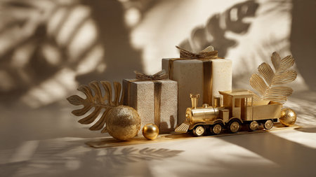 golden christmas decoration with train and gift box on green background