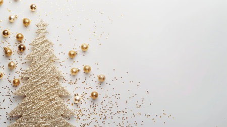 Glittery golden Christmas tree with ornaments confetti on a white background, festive holiday decorations concept