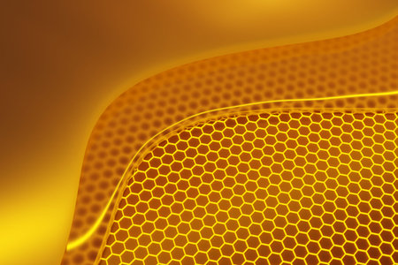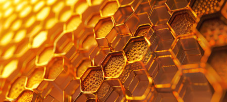 Stylized Honeycomb pattern with honey. Hexagonal Beeswax structure. Concept of apiculture, beekeeping, honey production, artistic design. Digital art. Abstract background. Copy space. Banner